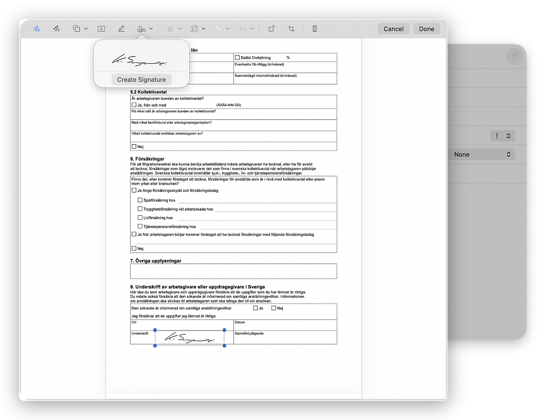You can either select a signature you have used in the past, or you can create a new signature. If you choose to create a new signature, you can either use the trackpad on your Mac to draw one, your iPhone, or you can write your signature on a piece of paper and then hold it up to the webcam on your Mac.