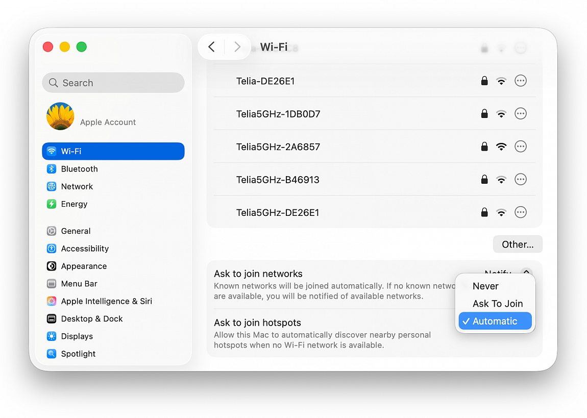 • Go to System Settings > Wi-Fi and choose Automatic for “Ask to join hotspots"